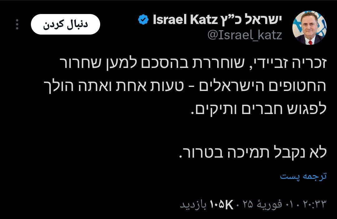 وقال مخاطبا قائد كتائب شهداء الأقصى في الضفة الغربية (الجناح العسكري لحركة فتح) الذي أفرج عنه من سجون الاحتلال الأسبوع الماضي ضمن اتفاق طوفان الأحرار: "أفرج عنكم". في صفقة لتحرير الرهائن الصهاينة.. بخطأ واحد فقط! "ستلتقي بأصدقاء قدامى... لن نقبل دعم الإرهاب".