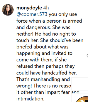 واعترض المستخدمون أيضًا على الطريقة التي تم بها اعتقاله، بما في ذلك حقيقة أن الضباط كانوا يرتدون ملابس مدنية؛ وكانوا يرتدون أقنعة ولم يقدموا أنفسهم.