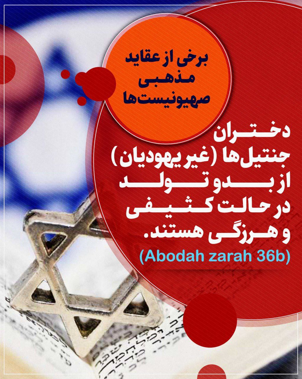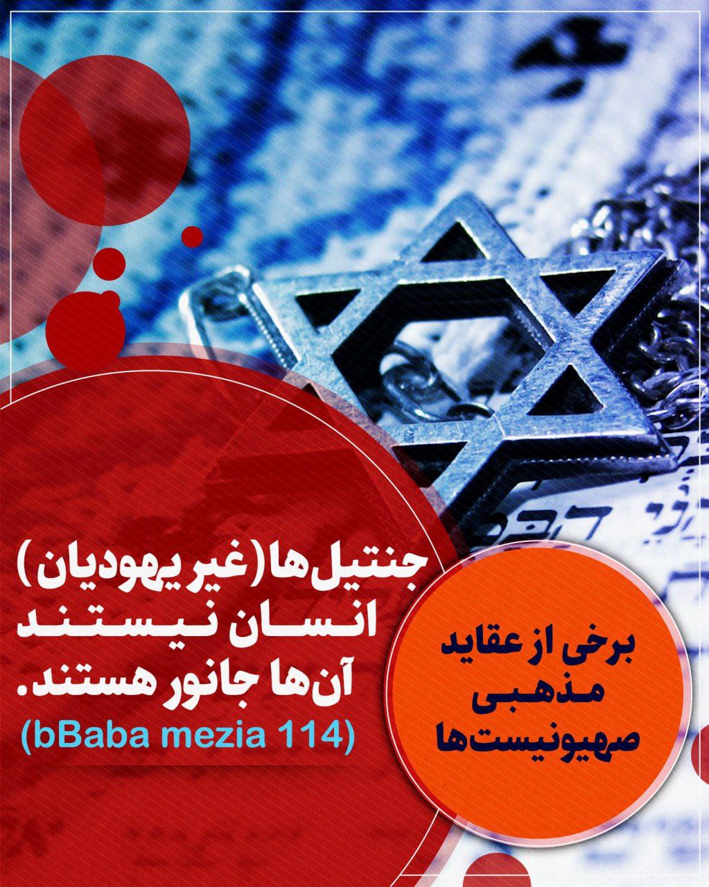 3- یهودی پیش خدا از ملائكه بالاتر است. هر گاه غیر یهودی، یهودی را بزند، مثل این است كه عزت الاهی را زده و مستحق مرگ خواهد بود. اگر یهودی آفریده نشده بود، بركت از زمین میرفت و باران نمیبارید و خورشید آفریده نمیشد.