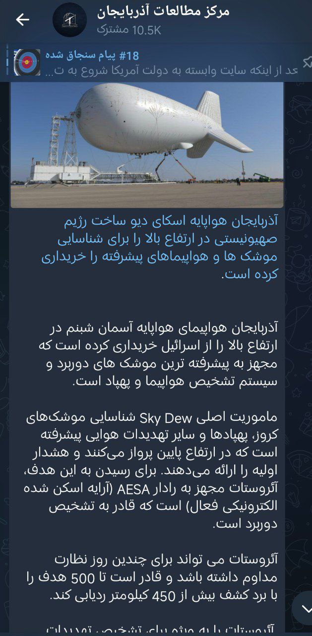 رسانه های گزارش دادند که بالون جاسوسی رژیم صهیونیستی بر فراز رودخانه ارس در نوار مرزی ایران و آذربایجان در حال رصد و جاسوسی و اختلال بوده است.