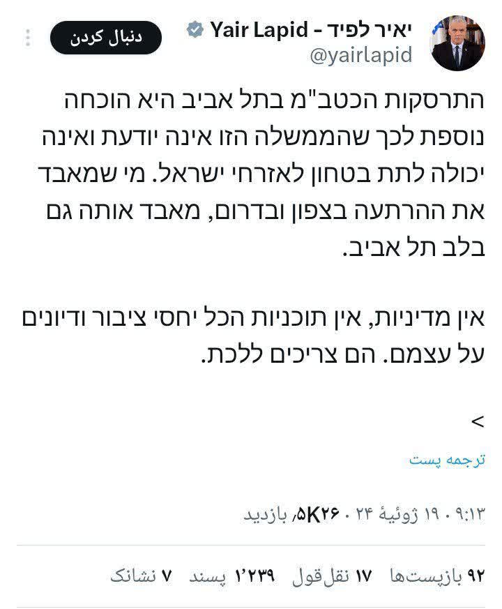 لاپید در شبکه ایکس (توئیتر سابق) گفت که حمله پهپادی به تلآویو «دلیل دیگری است که این دولت نمیداند و نمیتواند امنیت شهروندان اسرائیل را تامین کند».