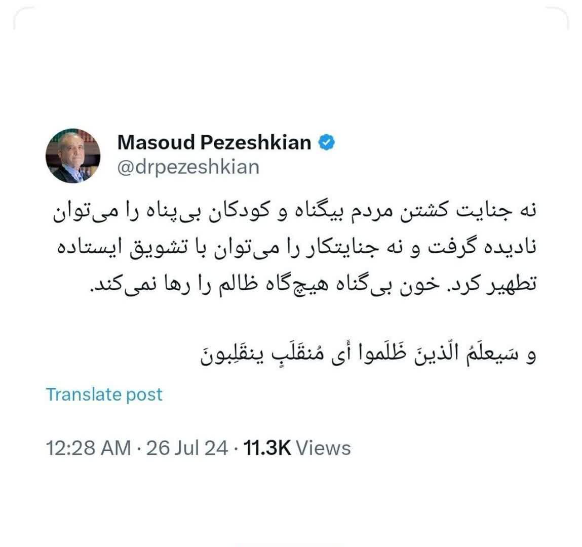 پزشکیان در این توییت تاکید کرد: « نه جنایت کشتن مردم بیگناه و کودکان بی‌پناه را می‌توان نادیده گرفت و نه جنایتکار را می‌توان با تشویق ایستاده تطهیر کرد. خون بی‌گناه هیچ‌گاه ظالم را رها نمی‌کند.و سَیعلَمُ الّذینَ ظَلَموا أَی مُنقَلَبٍ ینقَلِبونَ»