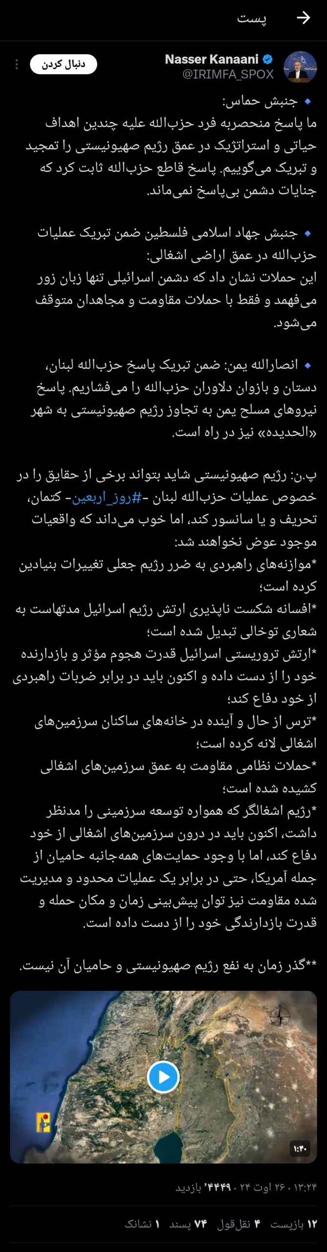 به گزارش شباب پرس، ناصر کنعانی، سخنگوی وزارت امور خارجه در واکنش به پاسخ حزب الله لبنان به رژیم صهیونیستی و تمجید گروههای مقاومت از اقدام حزب الله در حساب رسمی خود در برنامه ایکس نوشت: «جنبش حماس: ما پاسخ منحصربه فرد حزبالله علیه چندین اهداف حیاتی و استراتژیک در عمق رژیم صهیونیستی را تمجید و تبریک میگوییم. پاسخ قاطع حزبالله ثابت کرد که جنایات دشمن بیپاسخ نمیماند.»
