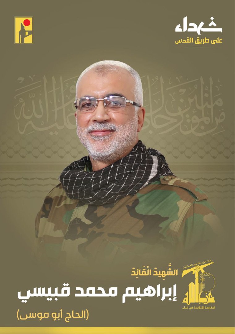 حزب‌الله در توضیح سوابق فرمانده ابراهیم محمد قبیسی گفت: «سردار شهید، که دیروز به درجه رفیع شهادت نائل آمده، رهبری تعدادی از یگان‌های موشکی مقاومت را برعهده داشت».