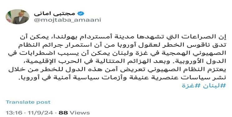 به گزارش شباب پرس، درگیریهای اخیر در شهر آمستردام هلند با واکنش مجتبی امانی سفیر ایران در بیروت مواجه شد.مجتبی امانی در همین ارتباط امروز (شنبه) ۱۹ آبانماه عنوان کرد: درگیریهای شهر آمستردام هلند، این زنگ خطر را میتواند برای عقلای اروپا به صدا درآورد که ادامه جنایات وحشیانه رژیم صهیونیستی در غزه و لبنان میتواند باعث ناآرامیهایی در کشورهای اروپایی شود.وی افزود: رژیم صهیونیستی پس از شکستهای پی در پی در جنگ منطقهای، قصد دارد با گسترش سیاستهای خشونتآمیز نژادپرستانه و بحرانهای سیاسی و امنیتی به اروپا، امنیت این کشورها را با خطر مواجه کند.