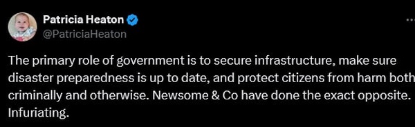 وی همچنین نوشت: نقش اصلی دولت ایمن سازی زیرساخت ها، اطمینان از به روز بودن آمادگی در برابر بلایا و محافظت از شهروندان در برابر آسیب های جنایی و غیره است، موضوعی که نیوسام و دوستانش دقیقا برعکس آن عمل کرده اند و این خشمگین کننده است.