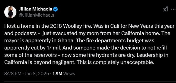 جیلیان مایکلز، دیگر چهره سرشناس آمریکایی، در نخستین روزهای آتش سوزی در ایکس (توئیتر سابق) نوشته بود: «شهردار، ظاهراً در غنا است. بودجه آتش نشانی ظاهراً 17 میلیون کاهش یافته است و شخصی تصمیم گرفت که برخی از مخازن (آب) را پر نکند – اکنون برخی از شیرهای آتش نشانی خشک هستند. رهبری در کالیفرنیا چیزی فراتر از سهل انگاری است. این کاملا غیر قابل قبول است.»