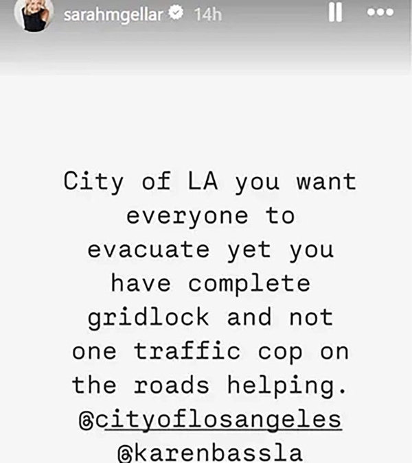 سارا میشل گلر، دیگر بازیگر آمریکایی نیز در پستی در اینستگرام خود با برچسبهایی برای ارسال آن به حسابهای رسمی رسانههای اجتماعی شهرداری لسآنجلس و شهردار «کارن باس»، نوشت: «شهر لسآنجلس، شما میخواهید همه این شهر را تخلیه کنند، در حالی که (جاده ها) به طور کامل مسدود هستند و شما حتی یک پلیس راهنمایی و رانندگی در جادهها (برای کمک) مستقر نکرده اید».