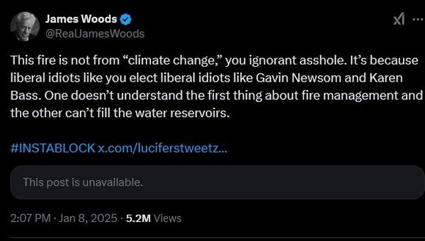 جیمز وودز، بازیگر مشهور آمریکایی که خانه خود را در آتشسوزی منطقه پالیسید از دست داد، در ایکس نوشت : این آتشسوزی ناشی از “تغییر آب و هوا” نیست، بلکه به دلیل “حماقت لیبرال هایی مانند گاوین نیوسوم و کارن باس” اتفاق افتاد. یکی (از این دو نفر) از مدیریت آتش نشانی چیزی نمی فهمد و دیگری نمی تواند مخازن آب را پر کند.
