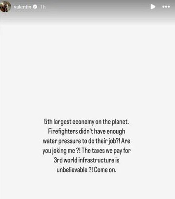 والنتین چمرکوفسکی، دیگر چهره معروف آمریکایی در اینستاگرام نوشت: « (این حقیقت دارد که) آتش نشان ها در پنجمین اقتصاد بزرگ روی کره زمین، فشار آب کافی برای انجام وظایف خود نداشتند؟! …(این در حالی است که) مالیات هایی که ما برای زیرساخت های جهان سومی می پردازیم باور نکردنی است.»