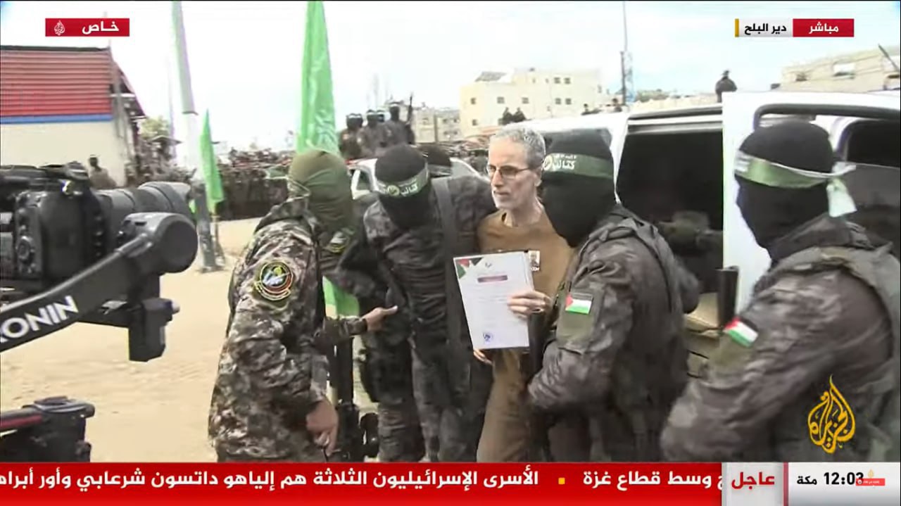 او در ادامه اضافه کرد: «از کتائب القسام تشکر میکنم. چون آنها یک سال و چهار ماه از ما نگهداری کردند و به ما آب و غذا دادند. بسیار تلاش کردند که ما زنده بمانیم… از شما تشکر میکنم.»