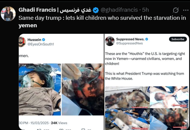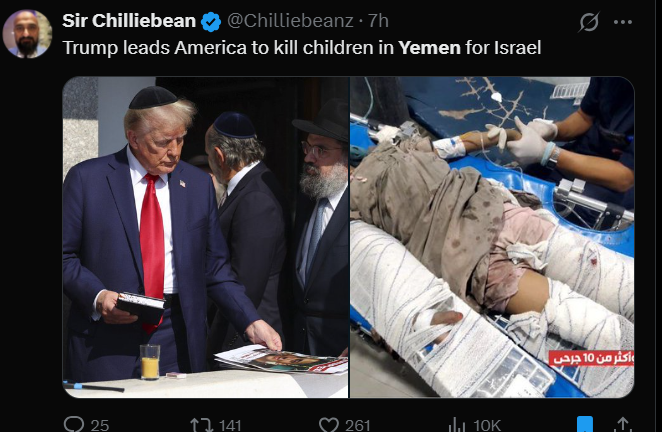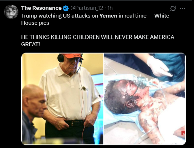 به گزارش شباب پرس، فعالان مجازی غربی با انتشار تصاویری از کودکان زخمی و آسیبدیده یمنی، اقدام اخیر رئیسجمهور ایالات متحده دونالد ترامپ را زیر سؤال برده و تصریح کردهاند که «او همان کسی است که قرار بود به جنگها پایان دهد».