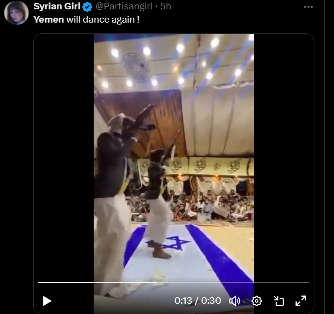 کاربری با به اشتراک گذاشتن فیلم رقص تفنگ مردم یمن درحالیکه پرچم رژیم صهیونیستی را زیر پا له میکنند؛ نوشته که یمن بار دیگر سرپا میشود و این چنین میرقصد.