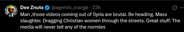 هذه الفيديوهات القادمة من سوريا وحشية. عمليات قطع الرؤوس والقتل الجماعي للنساء المسيحيات جرت في الشوارع. وسائل الإعلام لا تخبرك أبدًا بأي من القضايا.