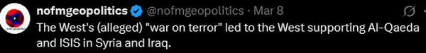 وقد أدت ما يسمى بـ"الحرب على الإرهاب" التي يشنها الغرب إلى دعم الغرب لتنظيم القاعدة وتنظيم الدولة الإسلامية في سوريا والعراق.