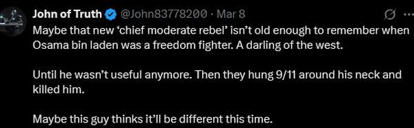 ولعل ذلك "المتمرد المعتدل الرئيسي" (الجولاني) ليس كبيراً بالقدر الكافي ليتذكر أن أسامة بن لادن كان ذات يوم مقاتلاً من أجل الحرية. لقد كان محبوباً لدى الغرب حتى لم يعد ذو فائدة لهم. ثم ألقوا عليه اللوم في أحداث 11 سبتمبر وقتلوه. ربما يظن هذا الرجل أن هذه المرة ستكون مختلفة.
