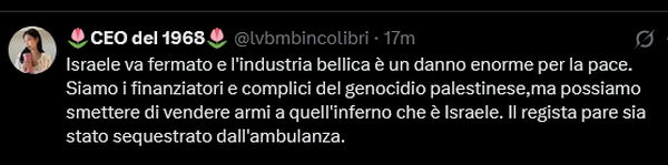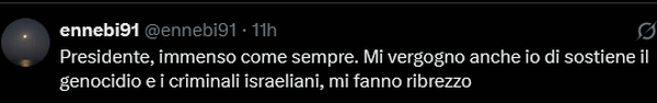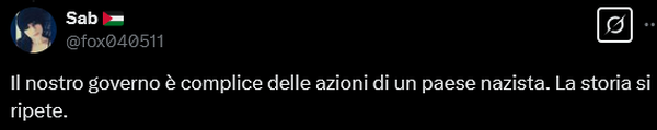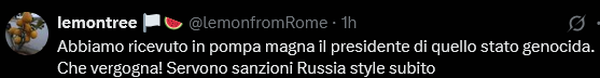 وتابع معربا عن خجله من نهج الحكومة الإيطالية في التعاون مع نتنياهو، وكتب: أشعر بالخجل لأن أوروبا اكتفت بإصدار تصريحات درامية ولم تكترث لهذه الجرائم. نحن بحاجة إلى أقصى العقوبات الدبلوماسية والاقتصادية، فضلاً عن حظر الأسلحة على النظام الصهيوني.