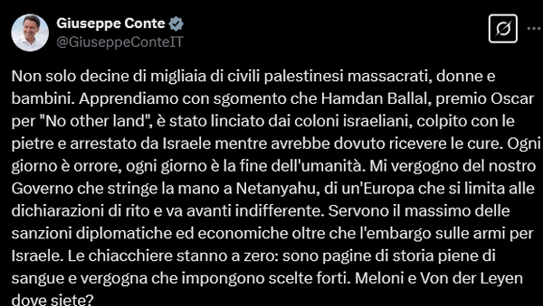 وكتب كونتي في هذا المنشور أمس: ولم يقتصر الأمر على قتل عشرات الآلاف من المدنيين الفلسطينيين، بما في ذلك النساء والأطفال، بل علمنا الآن بكل حزن أن حمدان بلال، الحائز على جائزة الأوسكار عن فيلم "لا أرض أخرى"، تعرض هو الآخر للهجوم بالحجارة من قبل المستوطنين، وتم اعتقاله من قبل الصهاينة. كل يوم هو يوم رعب، كل يوم هو يوم نهاية البشرية.