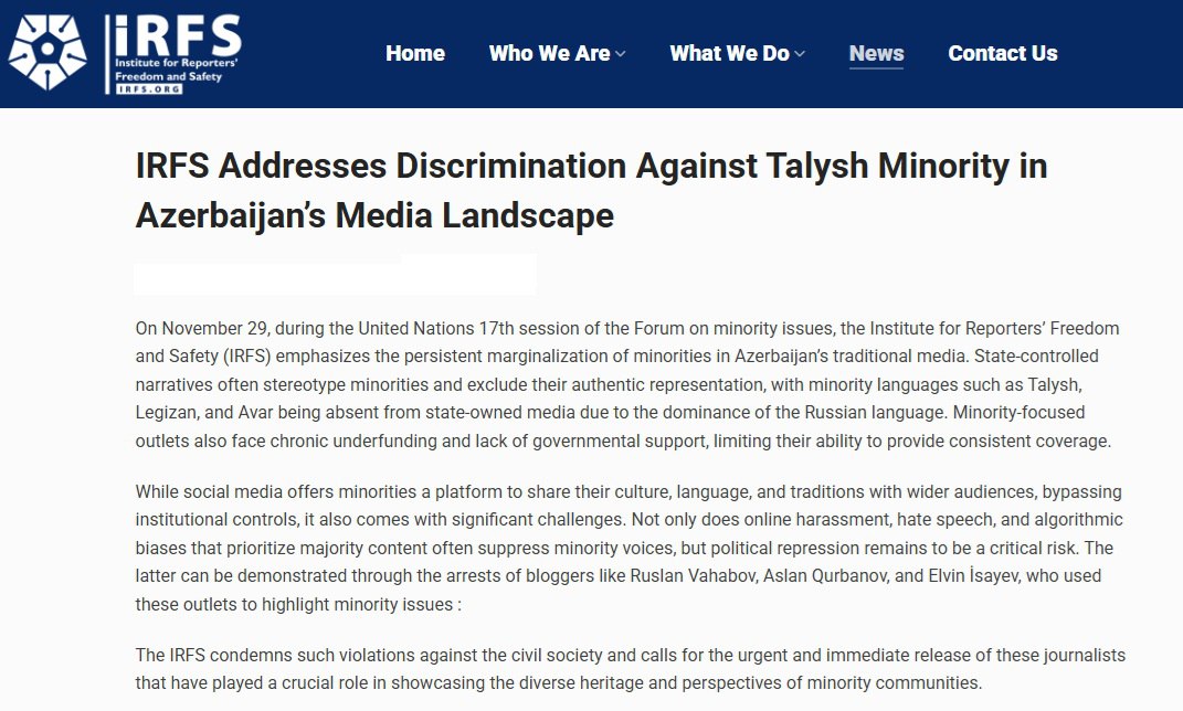 انتقد معهد حرية وسلامة الصحفيين النهج الإعلامي لجمهورية أذربيجان في تهميش الأقليات وتجاهل قضاياهم وأخبارهم وقمع حقوق ومطالب الأقليات العرقية.