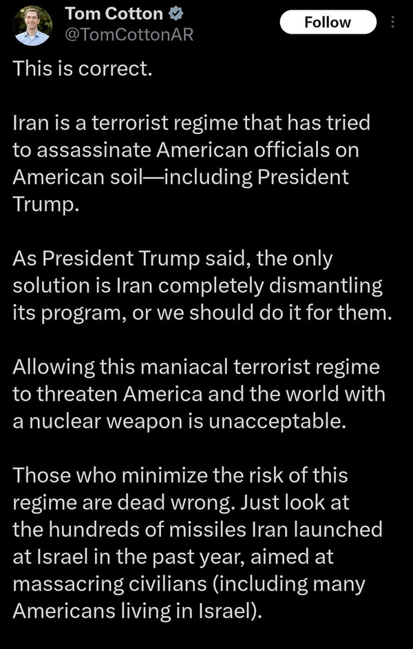 وكتب السيناتور الأمريكي البارز توم كوتون: "إيران نظام إرهابي حاول اغتيال مسؤولين أمريكيين، بما في ذلك الرئيس ترامب، على الأراضي الأمريكية". وكما قال ترامب، فإن الحل الوحيد هو أن توقف إيران برنامجها بالكامل، وإلا فإننا سنفعل ذلك من أجلهم. "من غير المقبول السماح لهذا النظام الإرهابي المجنون بتهديد أميركا والعالم بالأسلحة النووية".