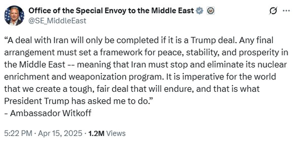 ولكن موقف فيتكاف تغير بسرعة. وقال في تغريدة: "الاتفاق الإيراني لن يتم الانتهاء منه إلا إذا سار وفقا لرغبات ترامب". ويجب على أي اتفاق نهائي أن يخلق إطارا للسلام والاستقرار والتقدم الاقتصادي في الشرق الأوسط؛ وهذا يعني أن إيران يجب أن توقف وتقضي تماما على برنامجها لتخصيب اليورانيوم وإنتاج الأسلحة النووية. "من الضروري للعالم أن يتوصل إلى اتفاق قوي ودائم، وهذا ما طلب مني الرئيس ترامب القيام به".