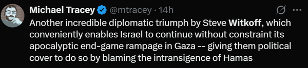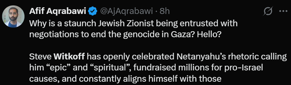 وكتب أحد الناشطين الافتراضيين على موقع X ساخرا إلى فيتكاف أن الدبلوماسي سمح بسهولة للنظام الإسرائيلي بمواصلة هجماته على غزة و"وفر لنفسه الغطاء السياسي الضروري من خلال إلقاء اللوم على حماس".