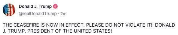 وفقًا لشباب برس ، كتب دونالد ترامب قبل لحظة في رسالة على الشبكة الاجتماعية سوشيال تروث الاجتماعية: لقد تم التوافق على وفق اطلاق النار. من فضلك لا تنتهكها! بعد ١٢ يوم من هجمات اسرائيل على جمهورية ايران الاسلامية وبعد الهجمات التي قامت بها ايران ليلة امس على قاعدة العديد الأمريكية في قطر ادعى ترامب وقف اطلاق النار بين ايران والنظام الصهيوني من الساعة 7 صباحا في الوقت المحلي (7:30 دقيقة بتوقيت طهران).