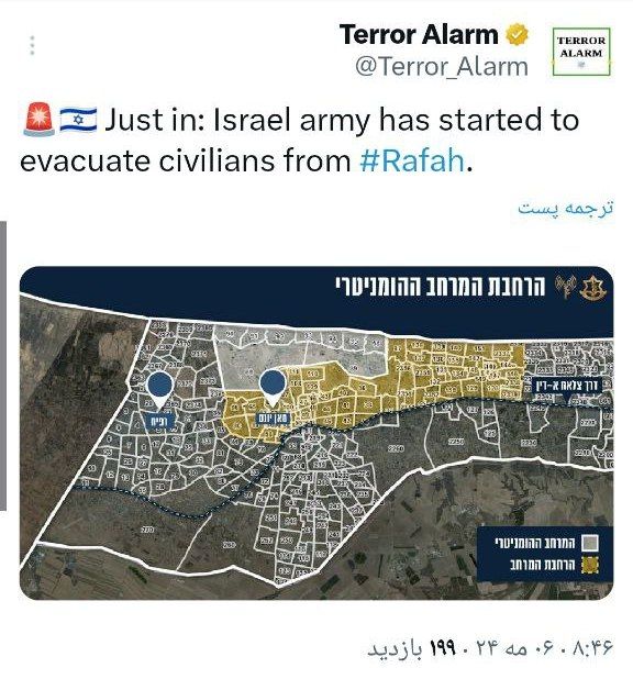 اکانت توییتری «ترور آلارم» از تخلیه غیرنظامیان فلسطینی از رفح، توسط ارتش رژیم صهیونیستی خبر داد.