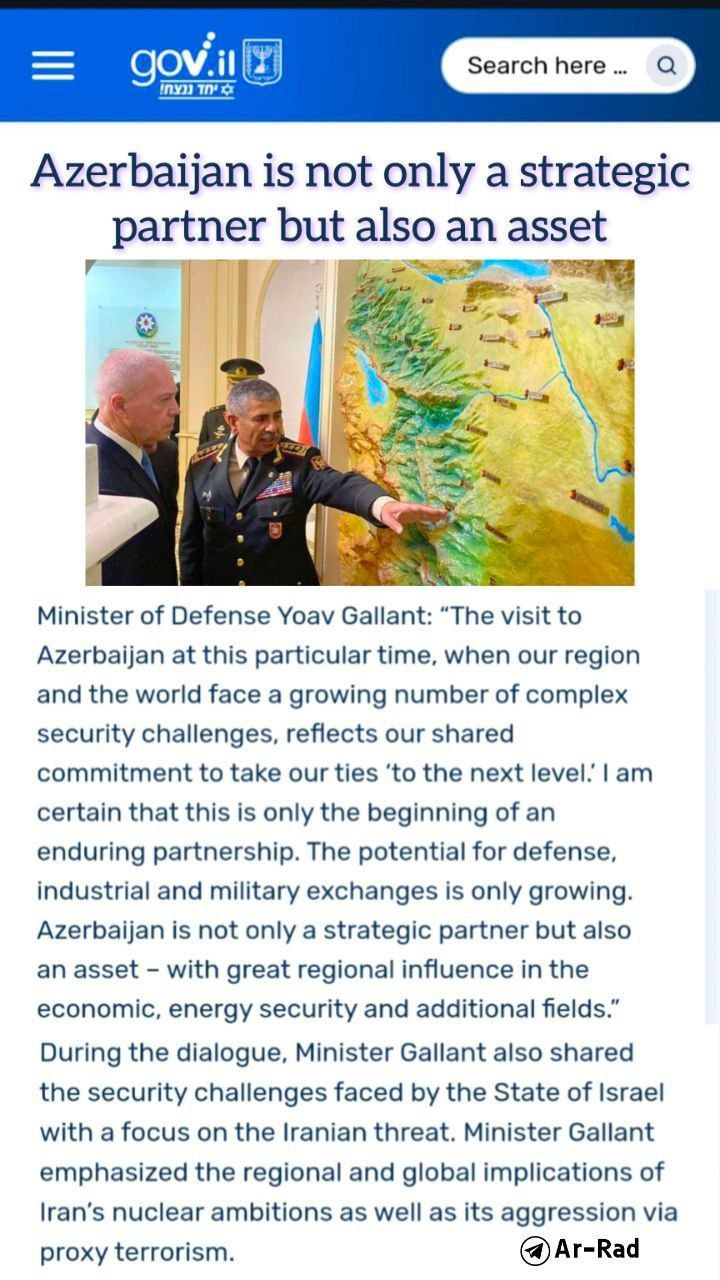 10 ماه پیش، یواف گالانت، وزیر دفاع رژیم صهیونیستی، در پایان سفر خود به آذربایجان، روابط رژیم صهیونیستی و آذربایجان را ستود و آذربایجان را “نه تنها یک شریک استراتژیک، بلکه یک دارایی” خواند.