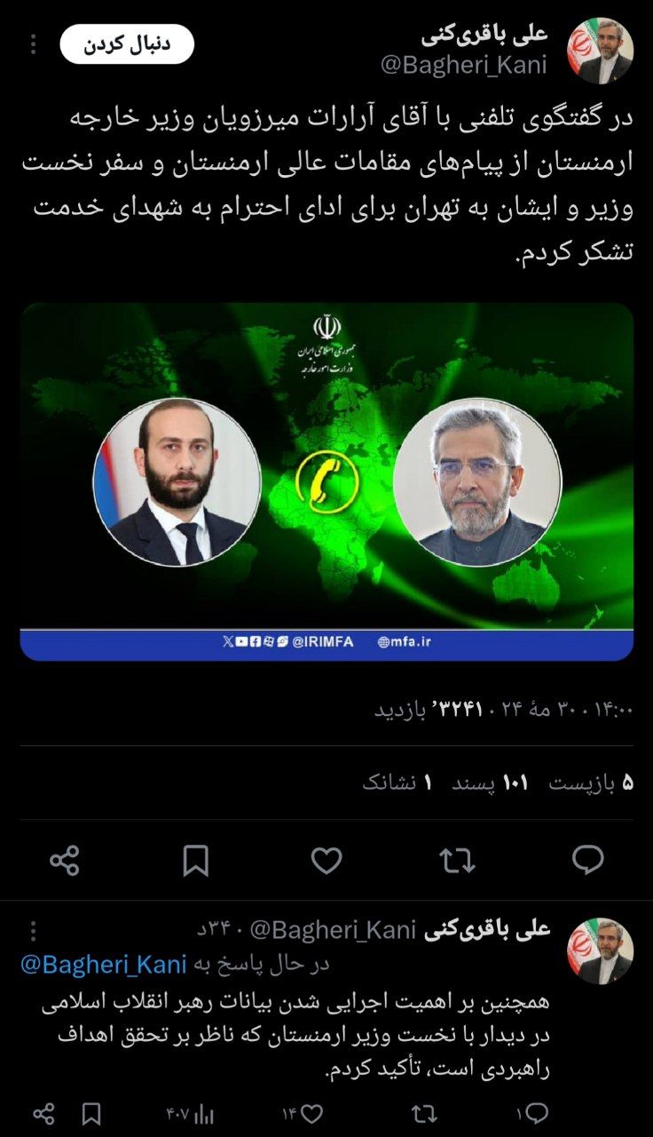 علی باقری در این خصوص در شبکه اجتماعی ایکس نوشت: در گفت‌وگوی تلفنی با آقای آرارات میرزویان وزیر خارجه ارمنستان از پیام‌های مقامات عالی ارمنستان و سفر نخست وزیر و ایشان به تهران برای ادای احترام به شهدای خدمت تشکر کردم.