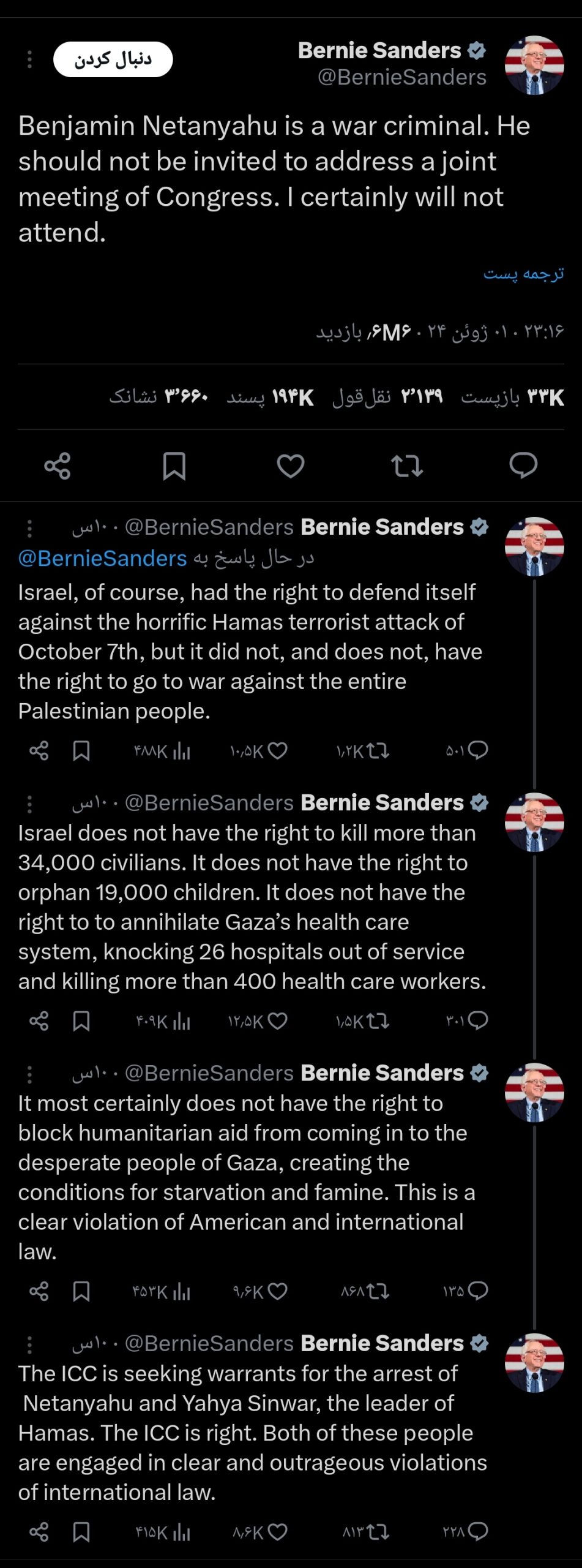 به گزارش شباب پرس، «برنی سندرز» سناتور آمریکایی با انتشار پیامی در شبکه اجتماعی ایکس اعلام کرد که «بنیامین نتانیاهو یک جنایتکار جنگی است و نباید از او دعوت شود که در کنگره آمریکا سخنرانی کند، من قطعاً در این نشست شرکت نخواهم کرد.»