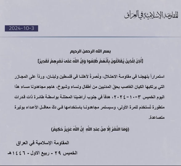 «کاظم الفرطوسی»، سخنگوی گردانهای سید الشهدای عراق هم امروز اظهار داشت: «ما به هدف گرفتن عمق اراضی اشغالی در راستای کمک به غزه و لبنان ادامه خواهیم داد.»