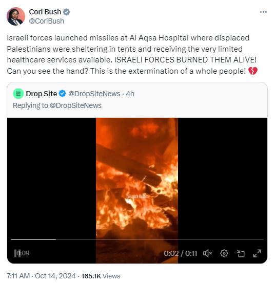 به گزارش شباب پرس، کوری بوش نماینده کنگره آمریکا در توییتی نسبت به حمله وحشیانه صهیونیستها به چادرهای اردوگاه آوارگان اهل غزه در بیمارستان الاقصی و آتشگرفتن اردوگاه نوشت: «نیروهای صهیونیستی موشکهایی را به سمت بیمارستان الاقصی پرتاب کردند، جایی که فلسطینیهای آواره در چادرها پناه گرفته بودند و خدمات بهداشتی بسیار محدودی را دریافت می کردند. نیروهای صهیونیستی آنها را زنده زنده سوزاندند! آیا میتوانید ببینید؟ این نابودی یک ملت است!»