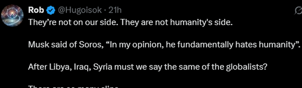 آنها (غرب) طرف ما نیستند. آنها طرف انسانیت نیستند. ماسک در مورد سوروس گفت: “به نظر من، او اساساً از انسانیت متنفر است.” آیا بعد از لیبی، عراق، سوریه باید همین را در مورد جهانی گرایان بگوییم؟