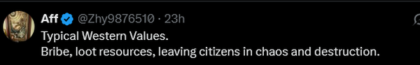 ارزشهای معمولی غربی: رشوه، غارت منابع، رهاکردن شهروندان در هرج و مرج و ویرانی.