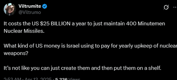 وتبلغ تكلفة صيانة 400 صاروخ نووي من طراز مينوتمن بالنسبة للولايات المتحدة 25 مليار دولار سنويا. ما نوع الأموال الأمريكية التي يستخدمها النظام الصهيوني لدفع تكاليف الصيانة السنوية للأسلحة النووية؟ من المؤكد أنه ليس بإمكانك بناءها ثم التخلص منها.