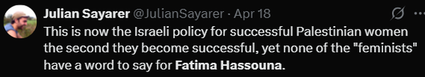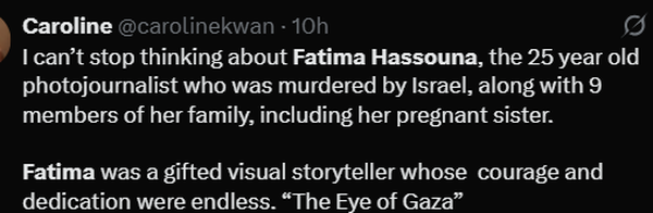 فرد دیگری نوشته که نمیتواند از فکر فاطمه و شهادت او بیرون بیاید. این کاربر تأکید کرده که فاطمه انسانی بااستعداد، شجاع و فداکار بوده است. این فرد تصریح کرده است که حسونا «چشم غزه بود» و با عکسهایش داستان غزه را به تصویر میکشید.