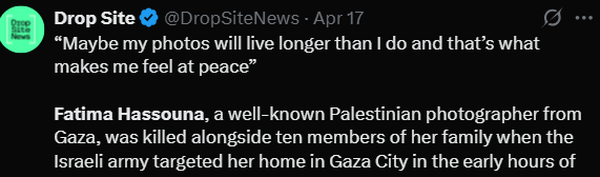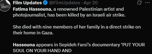 فاطمه حسونا، عکاس فلسطینی، تنها ۲۴ ساعت پس از پذیرش مستندش در جشنواره کَن، به همراه ۹ تن دیگر از اعضای خانوادهاش توسط رژیم صهیونیستی به شهادت رسید اما نامش در جهان بهویژه فضاهای مجازی، پرآوازه شد.