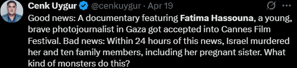 کاربری به شهادت فاطمه و خواهر باردارش اشاره و خطاب به صهیونیستها نوشته: «کدام هیولاها، چنین اقدامی را انجام میدهند؟»