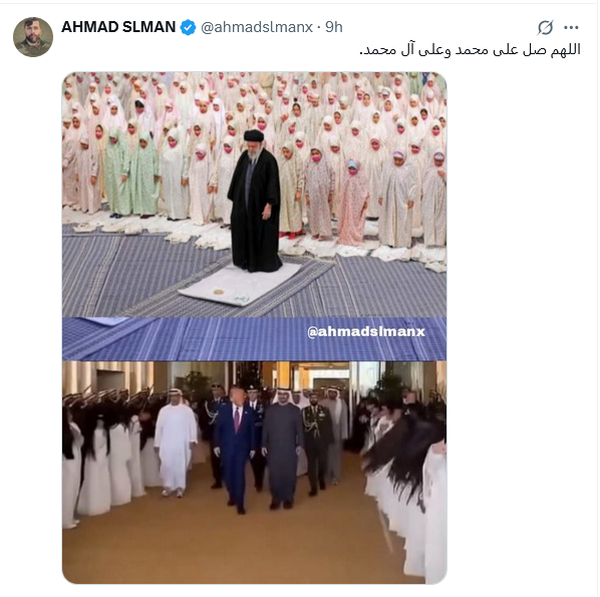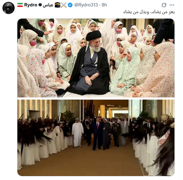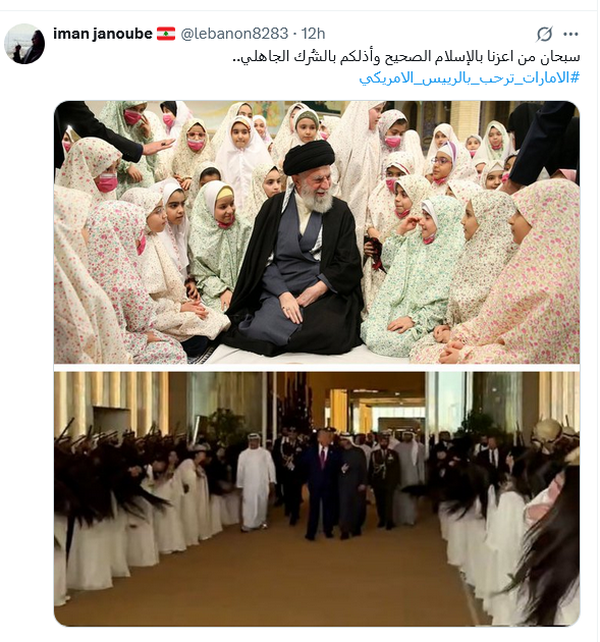 به گزارش شباب پرس، کاربران عربزبان با مقایسه عکسی از آیت الله خامنهای در کنار دختران محجبهای که در مراسم نماز جماعت جشن تکلیف خود با ایشان عکس یادگاری گرفتند و عکس رقص دختران در کنار حاکم امارات برای مراسم استقبال از ترامپ، دیدگاه رهبر ایران نسبت به جایگاه حقیقی دختران و زنان را ستوده و در مقابل، از بی غیرتی حکام عرب ابراز انزجار کردند.