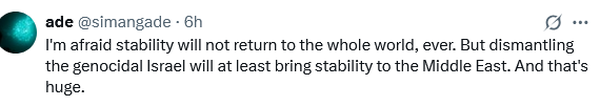 من نگرانم که ثبات هرگز به کل جهان بازنگردد. اما برچیدن رژیم صهیونیستی نسل‌کش حداقل ثبات را به خاورمیانه می‌آورد. و این خیلی دستاورد بزرگی است.