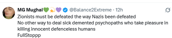 صهیونیست‌ها باید همانطور که نازی‌ها شکست خوردند، شکست داده شوند. هیچ راه دیگری برای مقابله با این روان‌پریش‌های بیمار و دیوانه‌ای که از کشتن انسان‌های بی‌گناه و بی‌دفاع لذت می‌برند، وجود ندارد. تمااااام