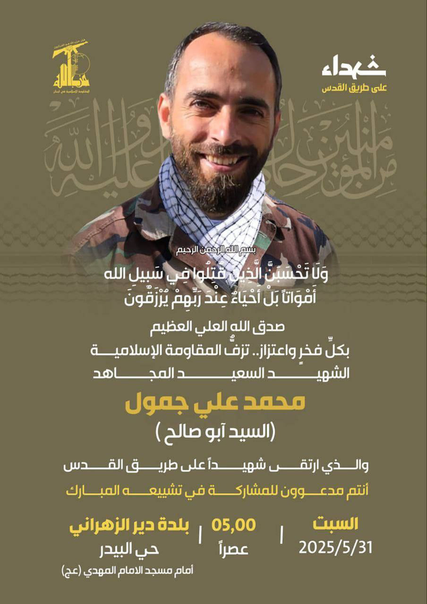 وأفادت وكالة "شباب برس" أن حزب الله اللبناني أكد استشهاد "محمد علي جمول" على يد الكيان الصهيوني في بلدة دير الزهراني جنوب لبنان. وأعلن جيش الاحتلال الصهيوني صباح اليوم نجاحه في اغتيال قائد وحدة الصواريخ التابعة لحزب الله في منطقة الشقيف.
