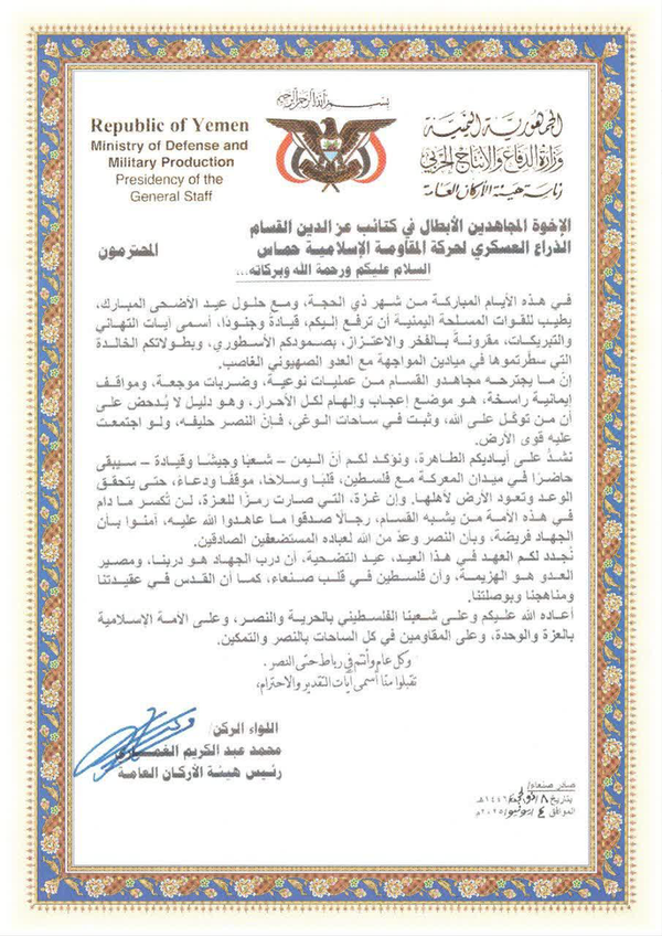 رئیس ستاد کل ارتش یمن در پیامی به گردانهای شهید قسام تاکید کرد که ارتش و مردم این کشور تا تحقق وعده پیروزی و آزادسازی اراضی اشغالی درکنار مردم فلسطین باقی خواهد ماند.