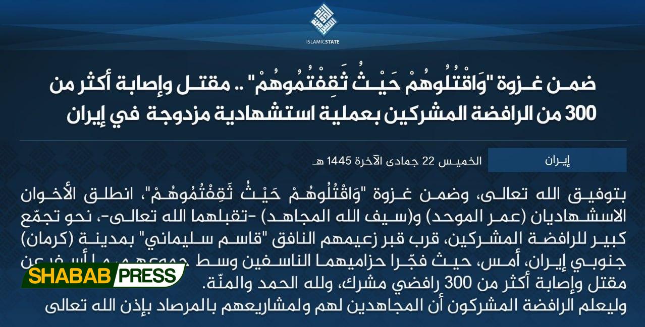 به گزارش گروه بین‌الملل خبرگزاری شباب پرس،  شبکه خبری العربیه گزارش داد که گروه تروریستی داعش با انتشار بیانیه‌ای، رسما مسئولیت حمله تروریستی روز گذشته به گلزار شهدای کرمان را بر عهده گرفت.