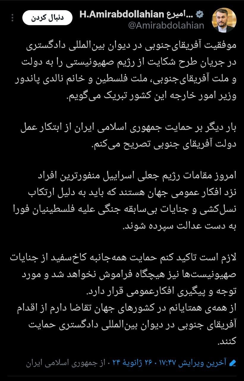 امیرعبداللهیان وزیر امور خارجه کشورمان از همتایان خود در کشورهای جهان تقاضا کرد از اقدام آفریقای جنوبی در دیوان بینالمللی دادگستری حمایت کنند