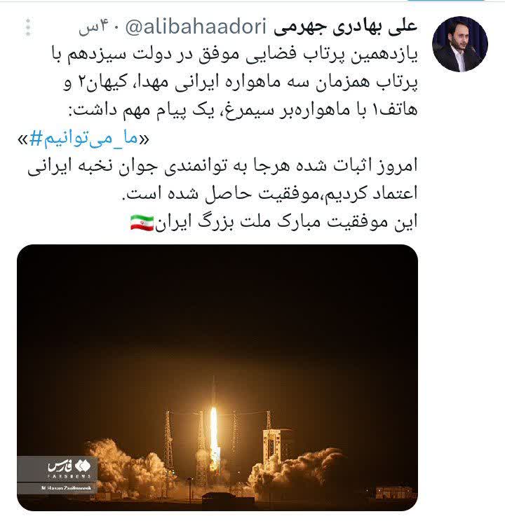 به گزارش شباب پرس، بهادری جهرمی، سخنگوی دولت در حساب شخصی خود در شبکه ایکس نوشت: یازدهمین پرتاب فضایی موفق در دولت سیزدهم با پرتاب همزمان سه ماهواره ایرانی مهدا، کیهان ۲ و هاتف ۱ با ماهواره‌بر سیمرغ، یک پیام مهم داشت؛ ما می‌توانیم.