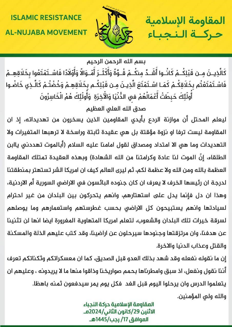 اشاره النجباء به حمله شب گذشته به مقر نظامیان آمریکایی در پایگاه التنف واقع در سوریه است که به کشته شدن سه نظامی آمریکایی منجر شد. مسئولان آمریکایی مدعی بودند که این حمله در خاک اردن صورت گرفت، ولی سخنگوی دولت اردن رسما این مسئله را تکذیب کرد و گفت که حمله مذکور در خاک سوریه رخ داده است.