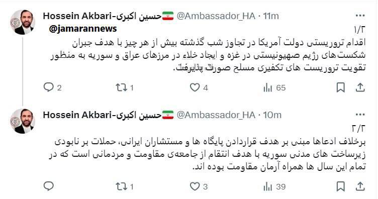 حسین اکبری، سفیر ایران در سوریه در توییتی نوشت: اقدام تروریستی دولت آمریکا در تجاوز شب گذشته بیش از هر چیز با هدف جبران شکست‌های رژیم صهيونيستی در غزه و ایجاد خلاء در مرزهای عراق و سوریه به منظور تقویت تروریست های تکفیری مسلح صورت پذیرفت.