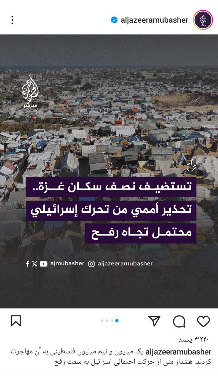 به گزارش الجزیره یک و نیم میلیون فلسطینی آواره، در رفح ساکن شدند. سازمان بین المللی نسبت به حرکت احتمالی رژیم صهیونیستی به سمت رفح هشدار داد